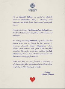 தயாரிப்பாளர் அருண் விஸ்வா தலைமையிலான சாந்தி டாக்கீஸ் தயாரிப்பில் அறிமுக இயக்குநர் ஹரிஹரசுதன் இயக்கத்தில் ஃபைனலி பாரத் மற்றும் ஷான்வி மேக்னா நடிக்கும் புதிய படமான ’புரொடக்ஷன் நம்பர். 4’ திரைப்படத்தின் அறிவிப்பு வெளியாகியுள்ளது. பல வருடங்களாக புதிய திறமையாளர்களையும் நல்ல கதைகளையும் ஊக்குவித்து படங்கள் தயாரித்து வரும் இந்நிறுவனம் தமிழ் சினிமா துறையில் தனக்கென தனியிடம் பிடித்துள்ளது.