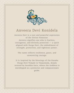 ✨Anveera Devi is a rare and powerful expression of the Divine Feminine. Anveera represents fearlessness, resilience and divine protection, inspired by the blessings of Kanaka Durga Devi. A name that reflects grace, courage and unwavering strength.